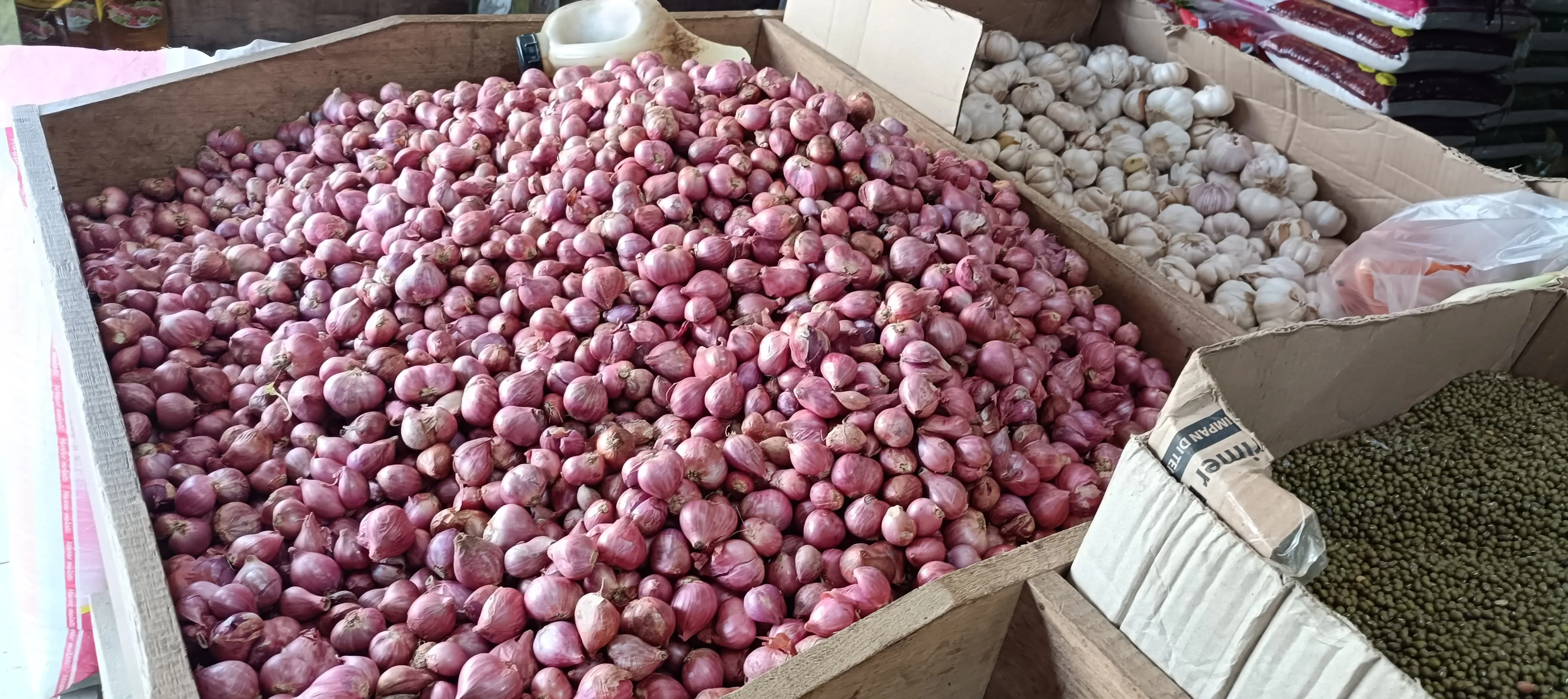 Bawang merah dijual di kisaran Rp45.000 per kilogram, sedangkan bawang putih berada di harga Rp35.000 per kilogram.
