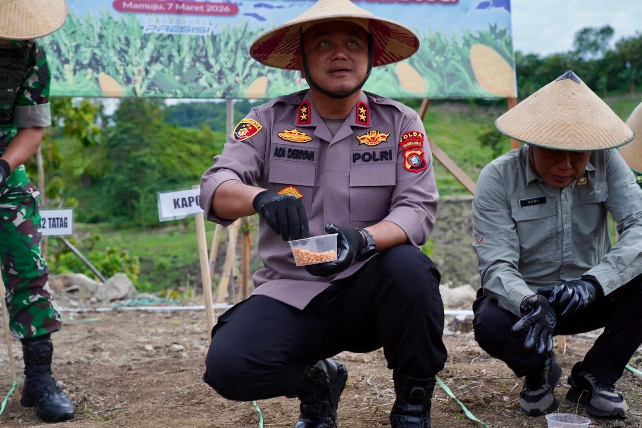 RRI.CO.ID, Mamuju - Setelah mengikuti kegiatan tanam raya jagung serentak kuartal I Tahun 2026 secara daring yang dipimpin langsung Kapolri, Kapolda Sulbar Irjen Pol Adi Deriyan Jayamarta bersama jajaran serta beberapa pejabat terkait melakukan aksi nyata penanaman jagung di halaman Joglo Balanipa Polda Sulbar, Sabtu 7 Maret 2026.