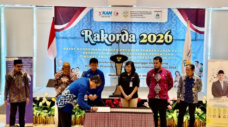 Sinergi tersebut diwujudkan melalui penandatanganan nota kesepahaman (MoU) yang berlangsung dalam Rapat Koordinasi Daerah (Rakorda) Program Pembangunan Keluarga, Kependudukan dan Keluarga Berencana tingkat Provinsi Sulawesi Barat di Grand Maleo Hotel, Kamis, 12 Maret 2026.