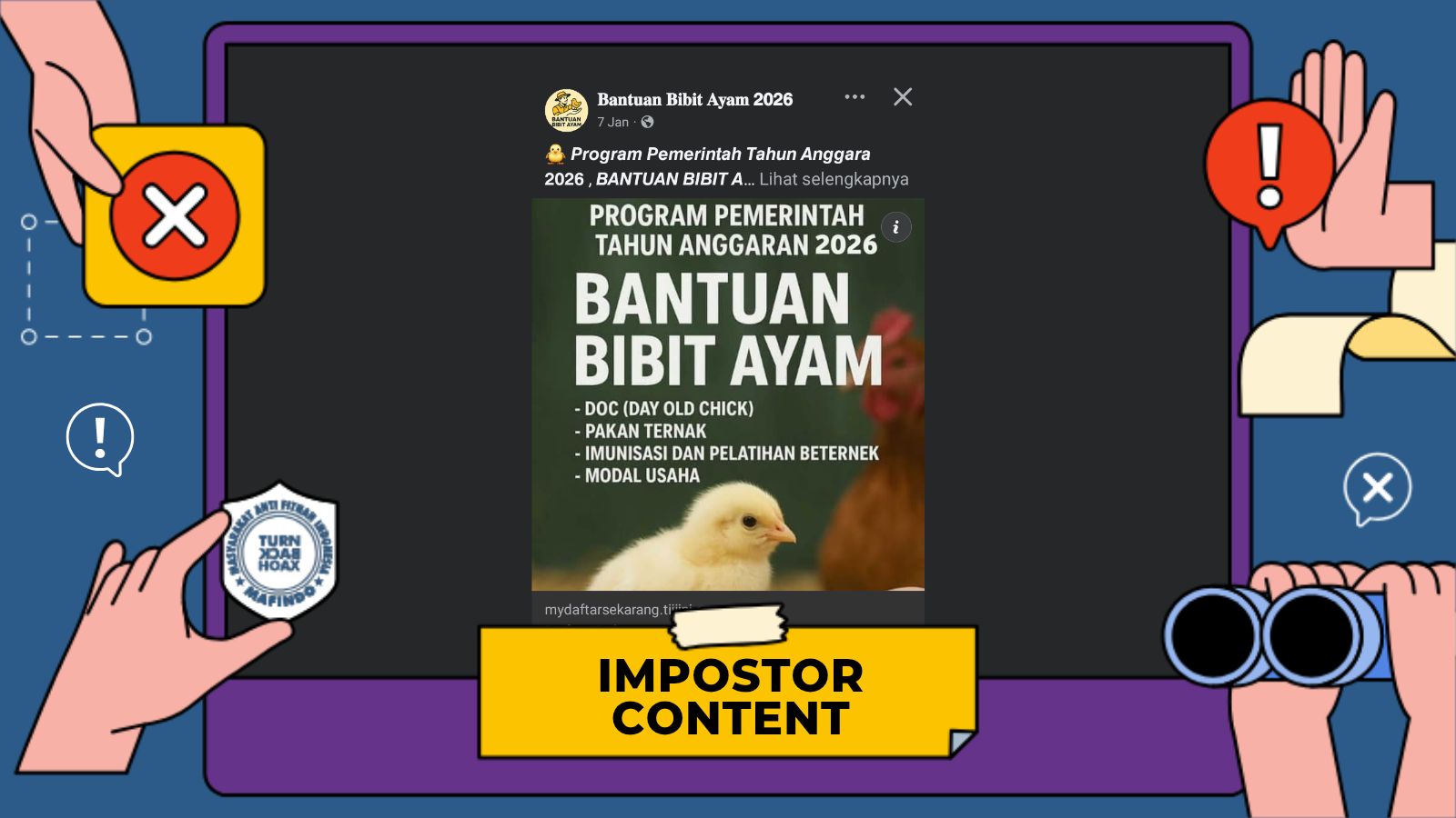 Dengan demikian, klaim dan tautan pendaftaran bantuan bibit ayam 2026 tersebut dinyatakan tidak benar dan termasuk konten tiruan yang berpotensi menipu masyarakat.
