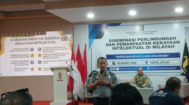 RRI.CO.ID, Mamuju - Kantor Wilayah Kementerian Hukum (Kemenkum) Sulawesi Barat menggelar diseminasi perlindungan dan pemanfaatan kekayaan intelektual dengan tema paten dan royalti lagu atau musik. Kegiatan yang berlangsung di Hotel Aflah Mamuju, Senin 9 Maret 2026 dan diikuti puluhan pelaku UMKM, industri hiburan, dan kalangan akademisi.