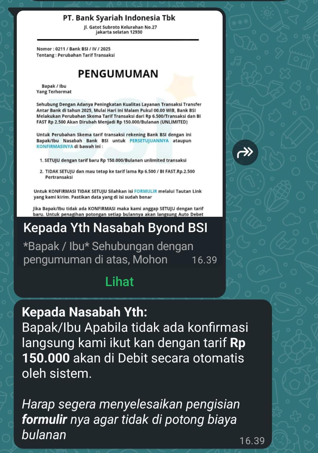 Baru-baru ini sebuah pesan singkat yang dikirim melalui aplikasi whatsaap berisi pesan tentang kebijakan perubahan skema tarif transaksi melalui bank tertentu beredar di kalangan masyarakat. Tampilannya cukup meyakinkan dengan latar belakang logo dari bank tertentu, nama kontak yang tertera sebagai Customer Service (CS ) atau bahkan dengan penggunaan nomor surat dan alamat resmi.