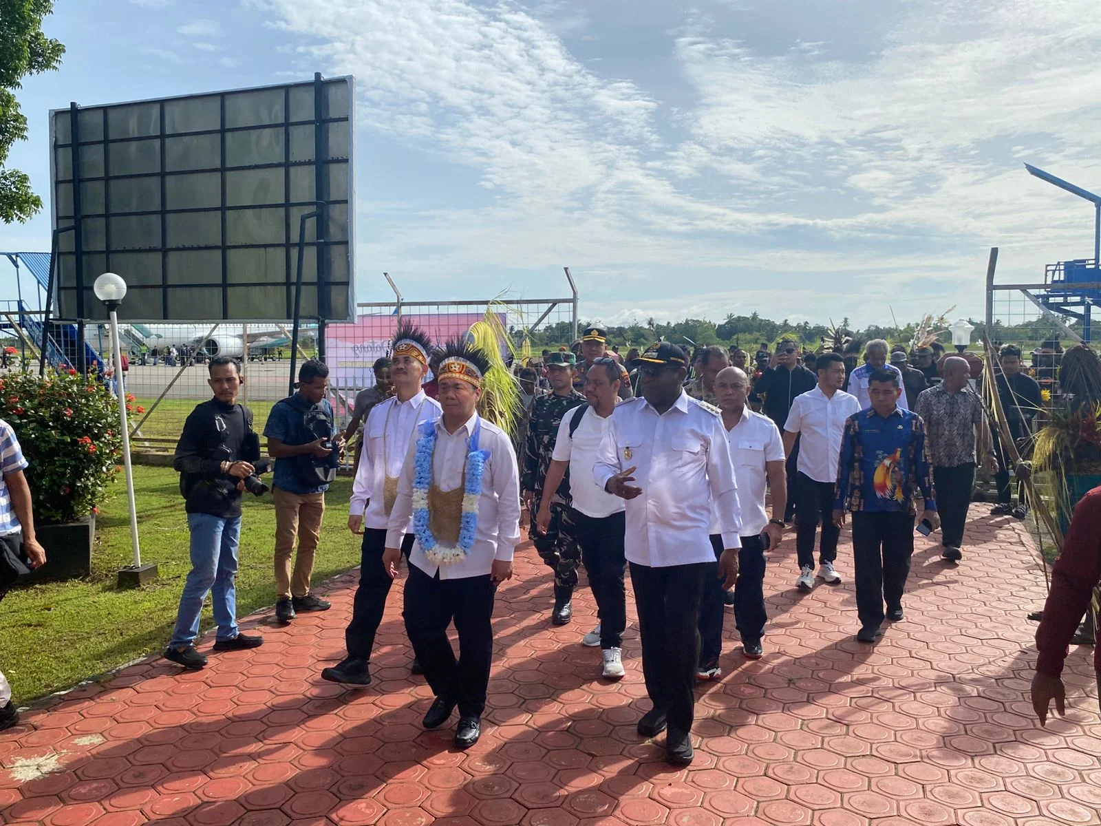 Rombongan Wamendes PDT RI tiba di Bandar Udara Mopah dan langsung disambut oleh unsur Forkopimda Kabupaten Merauke. Kapolres Merauke AKBP Leonardo Yoga bersama Bupati Merauke Yoseph Bladib Gebze dan Komandan Distrik Militer Merauke turut hadir menyambut langsung di ruang VIP bandara dengan prosesi penyambutan tarian adat khas Papua.