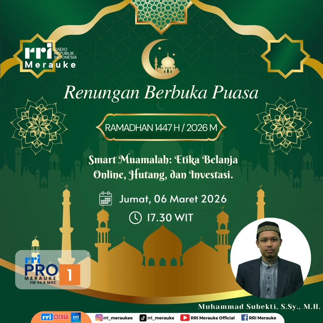 RRI.CO.ID, Merauke : Renungan berbuka puasa di Pro 1 RRI Merauke pada Jumat 06 Maret 2026 menghadirkan narasumber Muhammad Subekti, S.Sy., M.H yang mengangkat tema tentang etika muamalah di era digital, khususnya dalam belanja online, hutang, dan investasi. Dalam renungannya, ia mengajak umat Islam untuk tetap menjaga nilai-nilai syariah dalam aktivitas ekonomi sehari-hari.