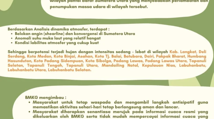 Berdasarkan kondisi tersebut, maka sebagian wilayah Sumatera Utara pada minggu ini diperkirakan masih akan mengalami hujan dengan intensitas sedang hingga lebat. Wilayah tersebut yakni Kabupaten Langkat, Deli Serdang, Kota Medan, Kota Binjai, Asahan dan Kota Tanjung Balai.