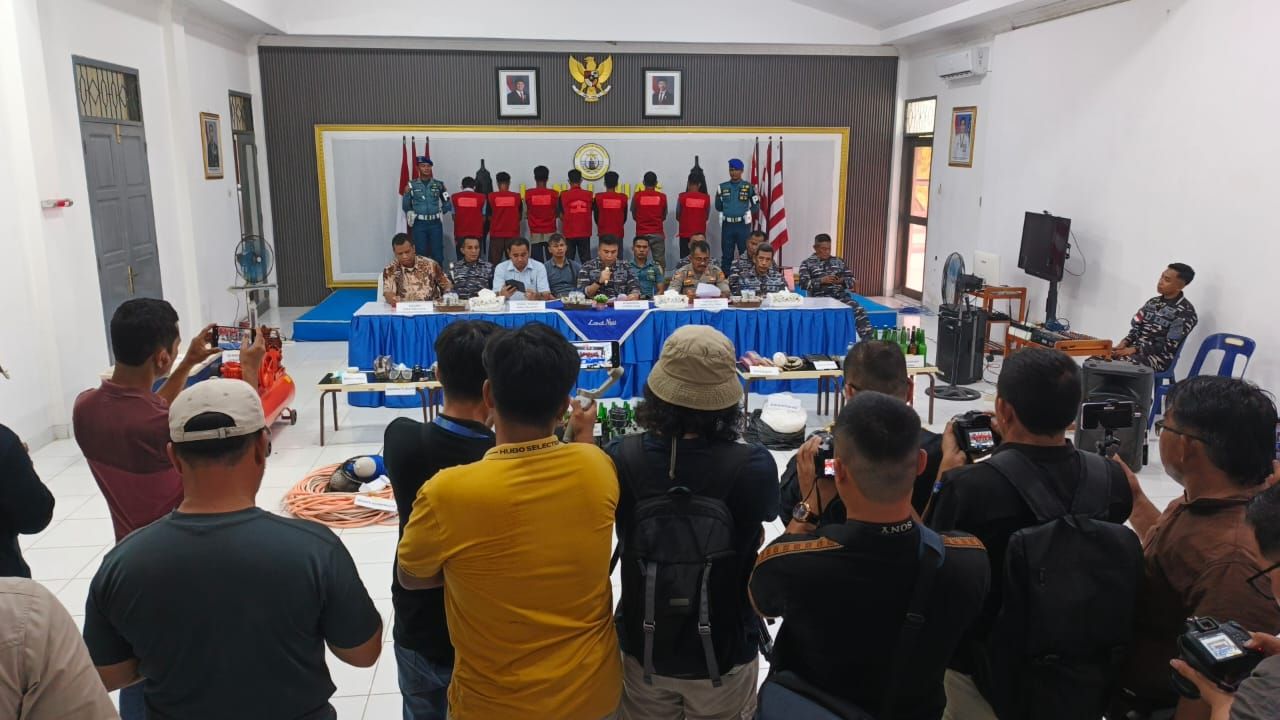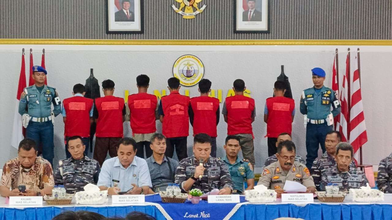 KBRN, Nias Selatan: Pangkalan TNI Angkatan Laut (LANAL) Nias menggelar konferensi pers terkait keberhasilan mereka mengamankan kapal yang diduga melakukan praktik illegal fishing menggunakan bahan peledak atau bom ikan. Penangkapan ini berlangsung di perairan Desa Reke, Kecamatan Pulau-Pulau Barat, Kabupaten Nias Selatan. Konferensi pers dilaksanakan di Markas Komando (Mako) LANAL Nias, Jumat (31/10/2025).