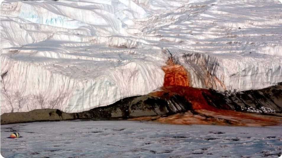 Warnanya bukan darah, melainkan air kaya zat besi yang teroksidasi saat terkena udara. Tersembunyi dibawah gletser, air terjun ini tertutup selama jutaan tahun, hingga akhirnya memiliki celah untuk keluar membawa mineral dan mikroba yang berasal dari masa lalu Bumi.