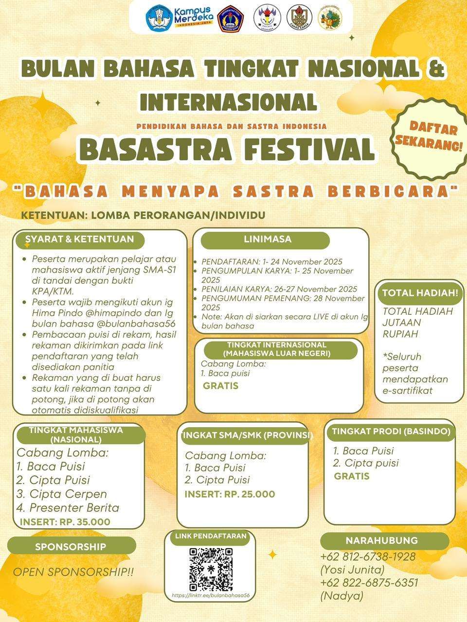 Bagi peserta dari SMA/SMK se-Sumatera Barat, tersedia Lomba Baca Puisi dan Cipta Puisi, dan khusus untuk mahasiswa Program Studi BASINDO UPGRISBA, diselenggarakan Lomba Cipta Puisi dan Baca Puisi. Seluruh perlombaan dilaksanakan secara online, membuka kesempatan seluas-luasnya bagi peserta dari berbagai daerah, bahkan luar negeri, untuk ikut berpartisipasi dan menyalurkan bakat sastra mereka tanpa batas ruang dan waktu.