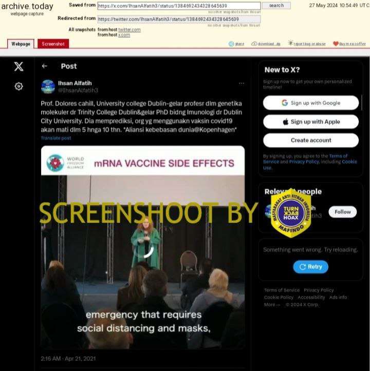 Dilansir dari laman turnbackhoax.id, berdasarkan hasil penelusuran, informasi tersebut menyesatkan. Klaim dari Dr. Dolores Cahill tersebut sudah pernah diklaim “tidak terbukti” oleh factcheck.org pada salah satu artikelnya yang berjudul “Video: Irish Professor Makes Unfounded Claims about Long-Term Effects of mRNA Vaccines”. Video dari artikel tersebut menjelaskan bahwa meskipun tidak ada vaksin atau dan/atau perawatan medis yang 100% aman, ‘clinical trials’ atau uji klinis selalu dilakukan untuk memeriksa apakah manfaat dari sebuah perawatan/obat lebih besar dari resikonya. Vaksin mRNA telah lolos uji klinis dan telah dinyatakan aman.
