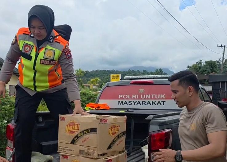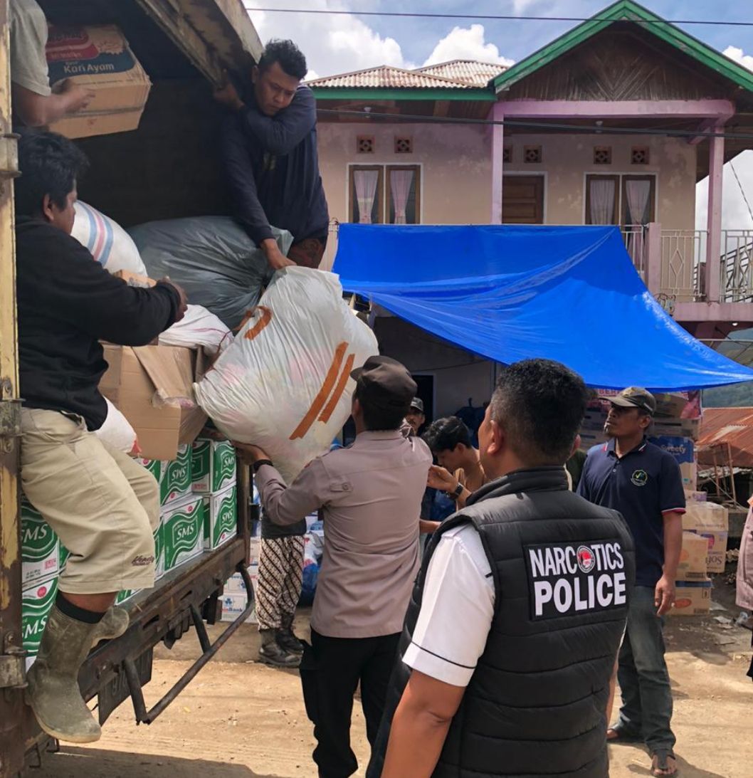 Satuan Narkoba Polresta Bukittinggi segera meluncur ke lokasi bencana, Jorong Galugua untuk mendistribusikan logistik. (Dok: Pribadi/Polresta Bukittinggi).