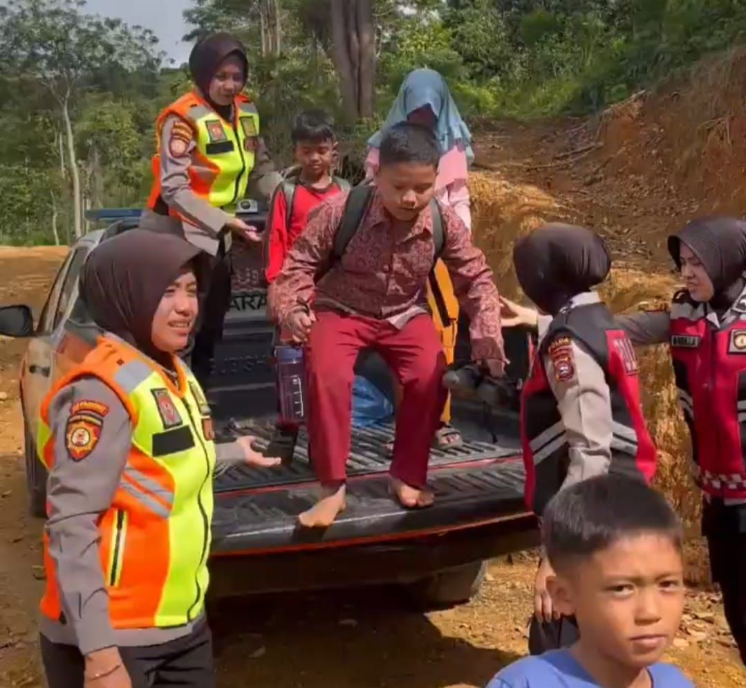 Ketika para polwan menaklukkan medan ekstrem demi memulihkan trauma anak-anak terdampak bencana. (Foto: Sri Darni/RRI Padang).