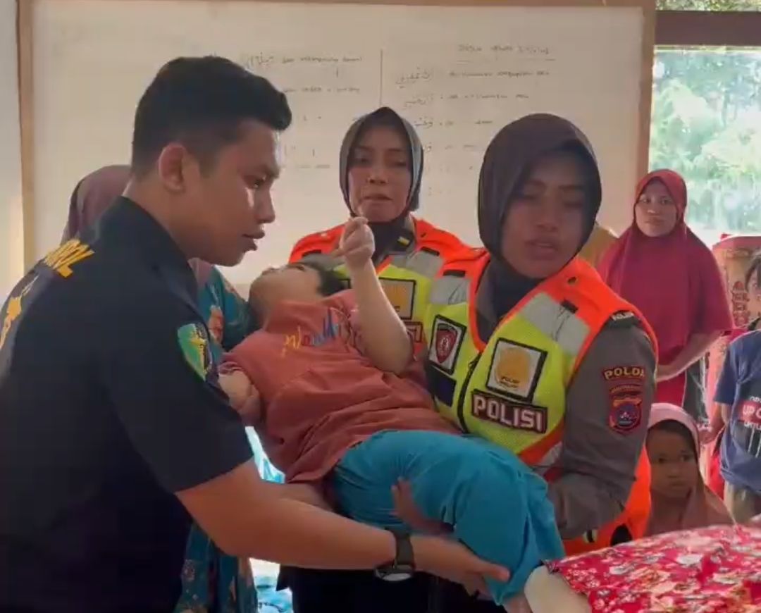 Tim kesehatan Polda Sumatera Barat melakukan penanganan kesehatan kepada anak terdampak bencana di pengungsian. (Foto: Sri Darni/RRI Padang)