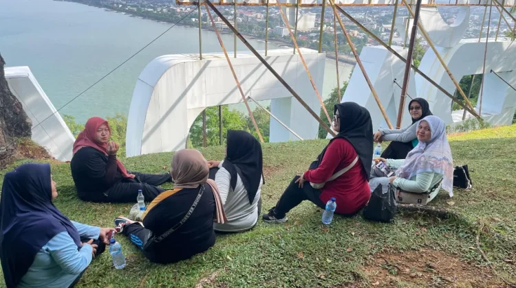 Suasana di puncak begitu hidup namun tenang. Sebagian pengunjung duduk bersandar pada bangku taman, sebagian lain sibuk mengabadikan momen, dan juga yang hanya menikmati hembusan angin. “Naiknya sebentar, tapi pemandangannya mahal,” ujar Ami.