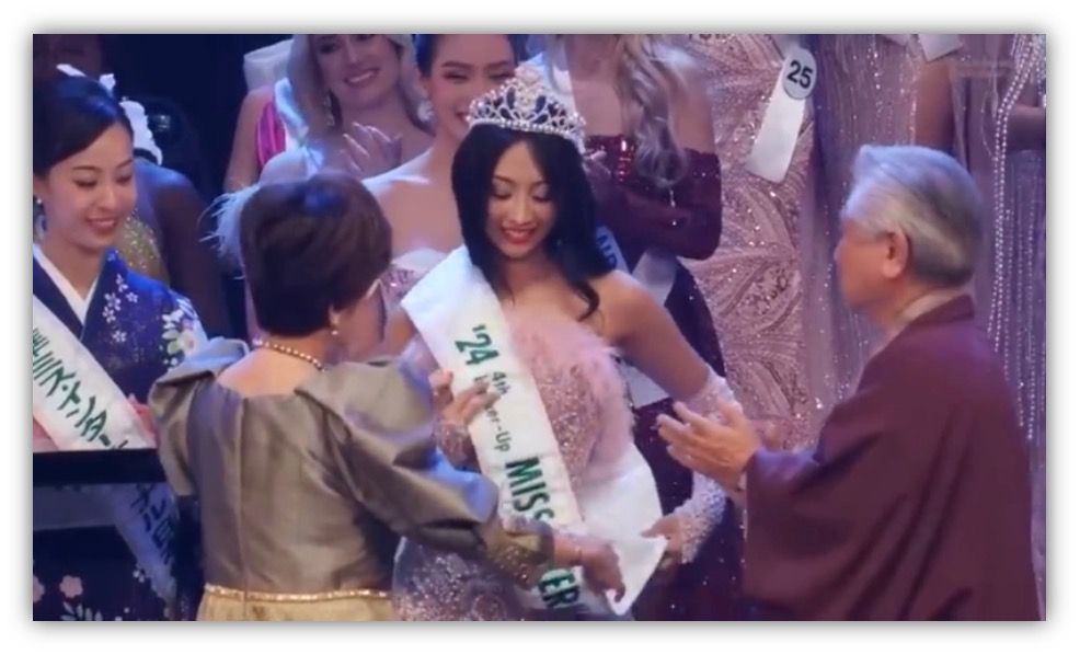 Tangkapan layar saat Sophie Kirana diberikan selempang dan mahkota sebagai Runner-up ke-4 di Miss International 2024. (Foto: YouTube Miss International)