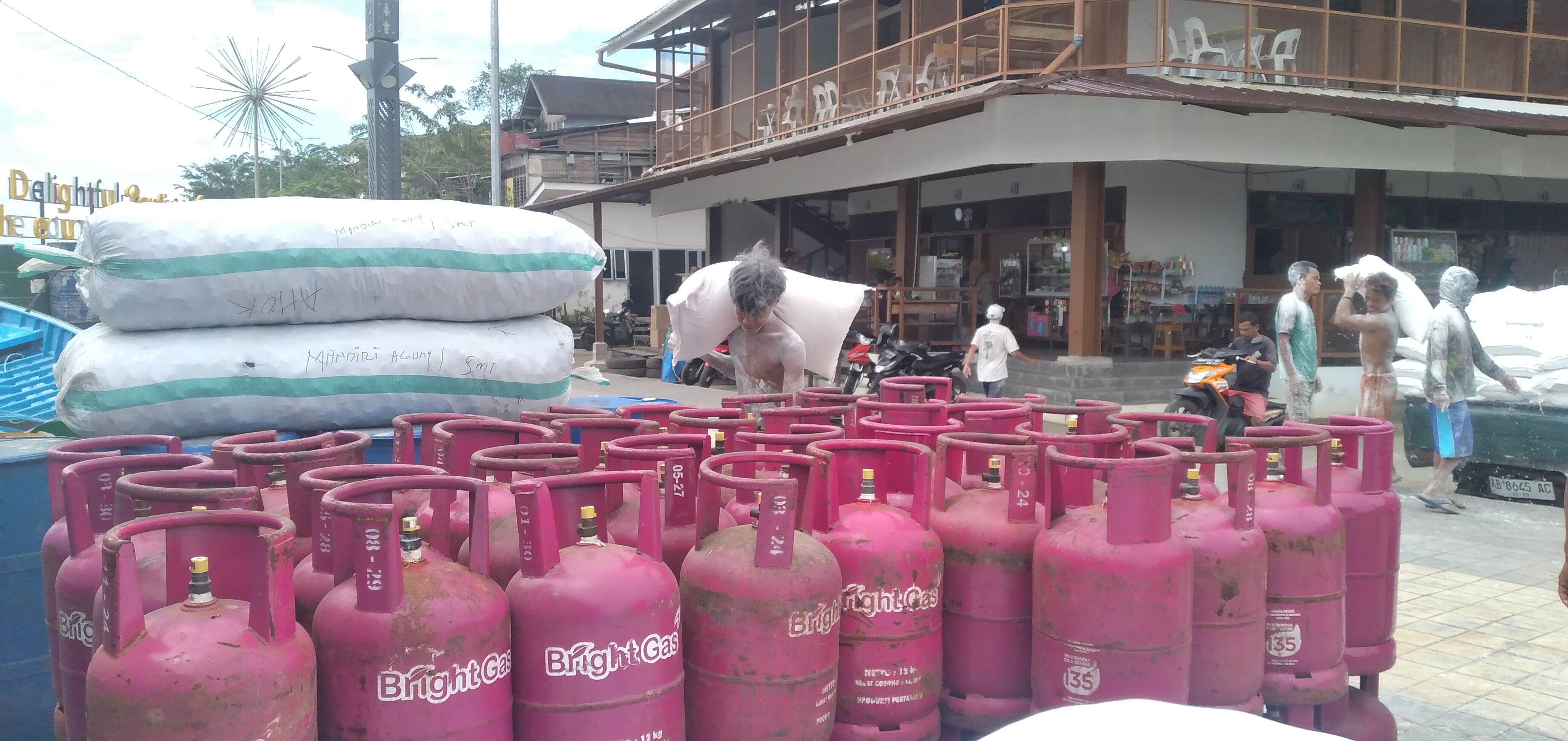 Seorang buruh angkut memikul sekarung tepung melewati deretan tabung elpiji menuju kapal bandong di Dermaga Kapuas Indah, Jumat (27/4/2025) (Foto: RRI/Boyke Sinurat)