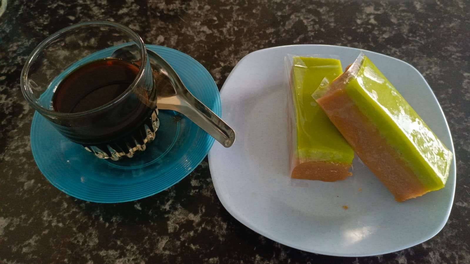 Namun, bintang sesungguhnya pagi ini adalah camilan yang menemani kopi tersebut: Dodol Ubi. Dua potong kue tradisional ini tersaji rapi di atas piring biru muda. Lapisan atas berwarna hijau cerah yang mengkilap, terbuat dari pandan, kontras indah dengan lapisan bawah berwarna cokelat karamel yang kenyal. Dodol Ubi ini adalah salah satu sajian khas Warkop Don yang selalu dinantikan.