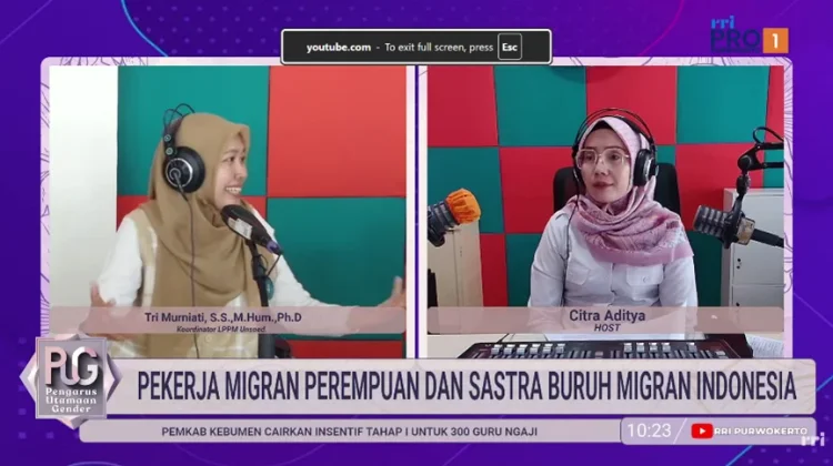 Berkaitan dengan hal tersebut, dialog Pengarus Utamaan Gender Pro 1 RRI Purwokerto bersama Tri Muniarti, S.S.,M.Hum.,Ph.D – Koordinator Pusat Riset Gender dan Anak LPPM Unsoed yang membahas tema “Pekerja Migran Perempuan dan Sastra Buruh Migran Indonesia”.
