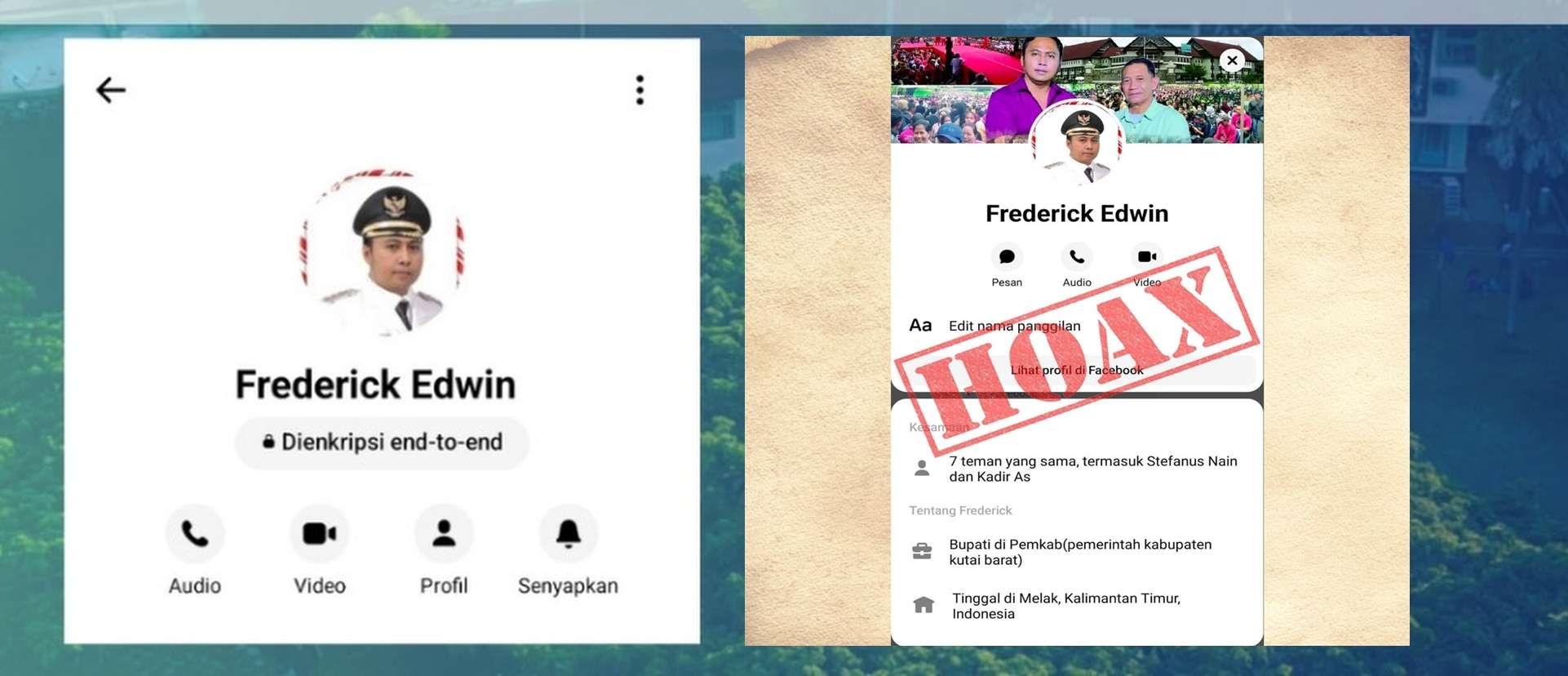 Akun tersebut memakai foto Frederick Edwin menggunakan baju putih pelantikan dengan latar belakang foto bupati Frederick Edwin dan wakil bupati Nanang Adriani yang memakai baju kemeja ungu dan hijau.