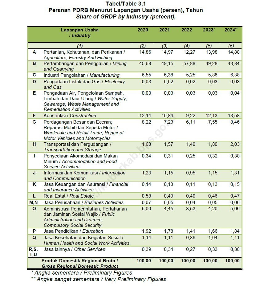 Berdasarkan data Badan Pusat Statistik (BPS), struktur perekonomian Kabupaten Kutai Barat dalam empat tahun terakhir (2020–2024) masih sangat bergantung pada sektor Pertambangan dan Penggalian. Kontribusi sektor ini terhadap Produk Domestik Regional Bruto (PDRB) tercatat sebagai yang terbesar, yakni 45,68 persen pada 2020, meningkat menjadi 49,15 persen pada 2021, bahkan mencapai 57,88 persen pada 2022. Meski menurun pada dua tahun berikutnya, pertambangan tetap mendominasi dengan kontribusi 49,28 persen pada 2023 dan 43,84 persen pada 2024.