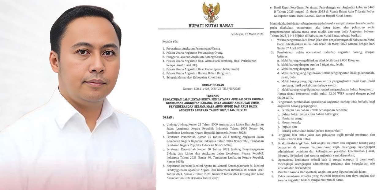 KBRN, Sendawar: Bupati Kutai Barat (Kubar), Frederick Edwin mengeluarkan kebijakan khusus untuk menjaga kelancaran dan keselamatan arus mudik serta arus balik Lebaran 2025. Yakni adanya pembatasan jumlah operasional kendaraan angkutan barang, daya angkut angkutan umum serta penyeberangan yang diberlakukan mulai 28 Maret hingga 7 April 2025.