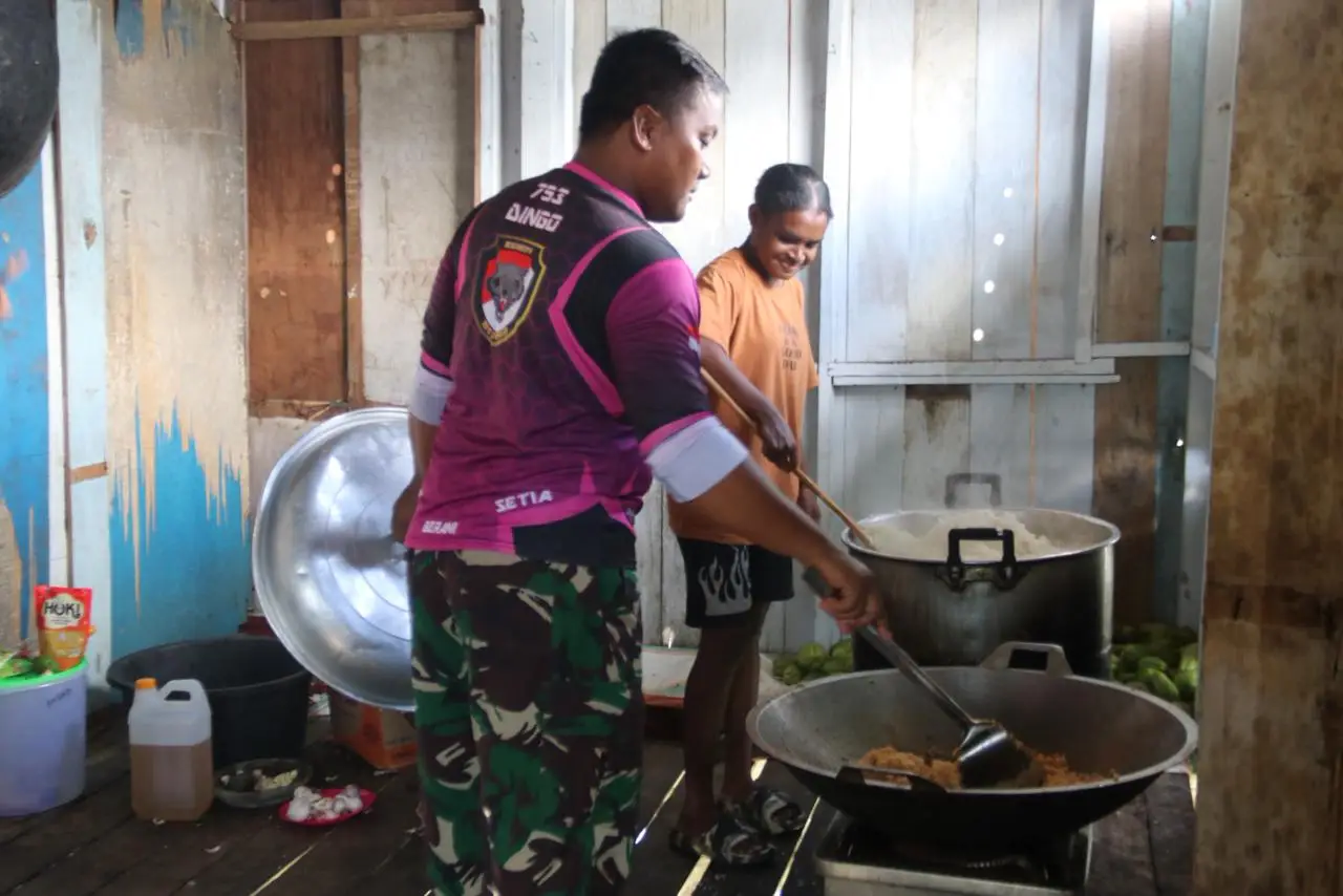 Di sela-sela kegiatan pembangunan, dapur menjadi ruang kebersamaan yang penuh cerita. Warga dengan sukarela menjadi juru masak dadakan, menyiapkan hidangan khas kampung, sementara para prajurit turut membantu menyiapkan bahan masakan, mulai dari membersihkan sayur hingga memotong ayam.