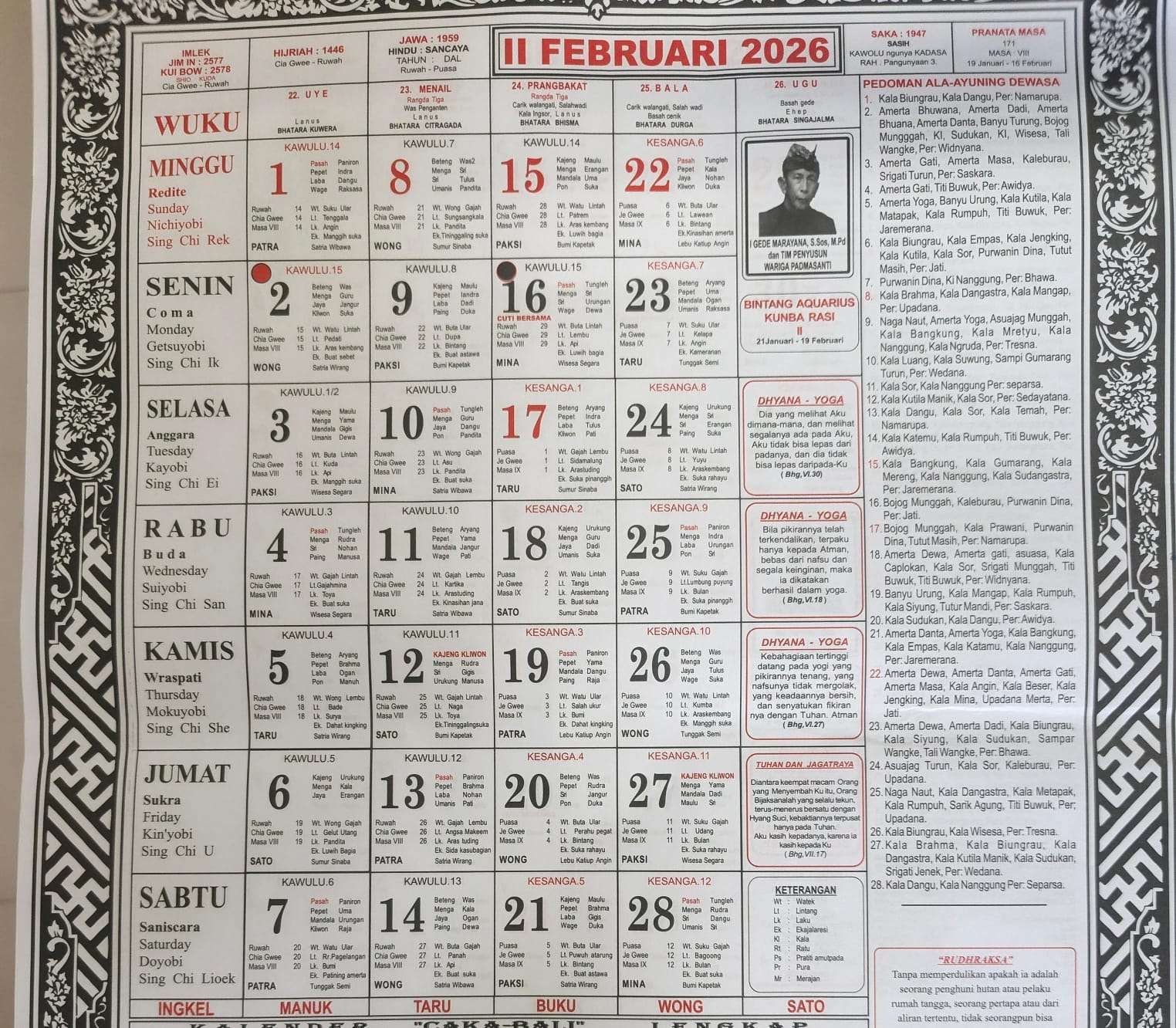 Peringatan dan Hari Suci Kalender Bali Februari 2026