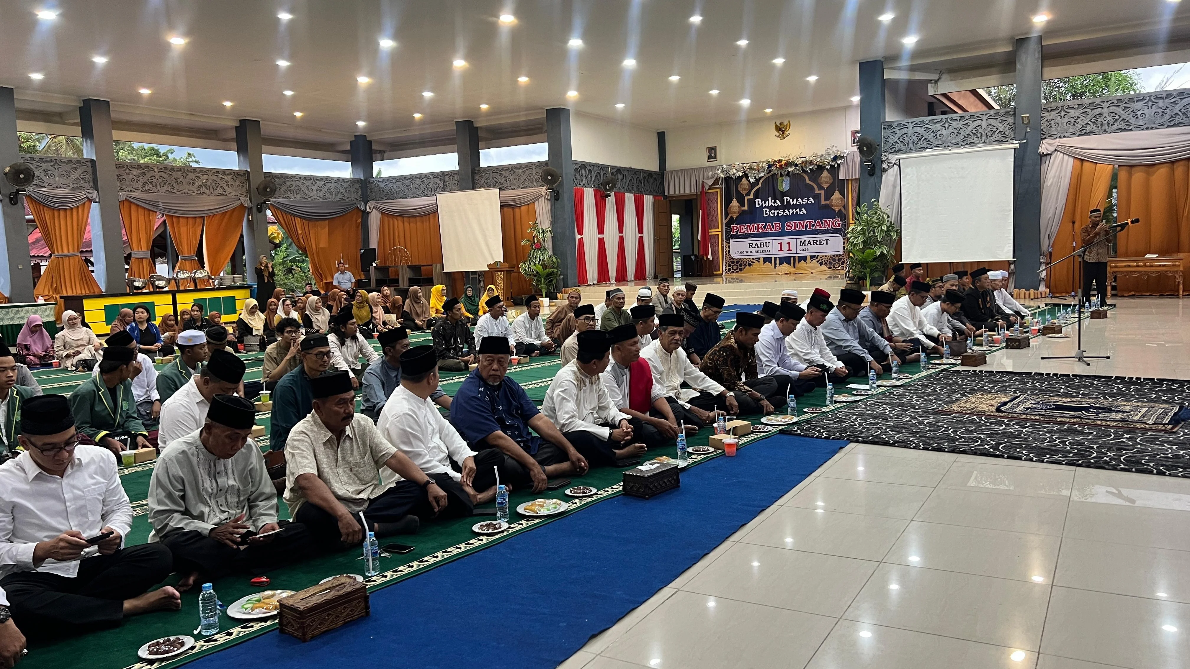 RRI.CO.ID, Sintang - Pemerintah Kabupaten Sintang menggelar acara buka puasa bersama jajaran Forkopimda, tokoh agama, dan tokoh masyarakat serta anak yatim piatu dari panti asuhan Mujahidin Sintang di Pendopo Rumah Jabatan Bupati Sintang pada Rabu 11 Maret 2026. Kegiatan ini merupaka agenda rutin tahunan yang dilaksanakan sebagai upaya memperkuat tali silaturahmi antara jajaran birokrasi dengan elemen masyarakat ditengah suasana khidmat bulan suci Ramadan 1447 Hijriah. (din)
