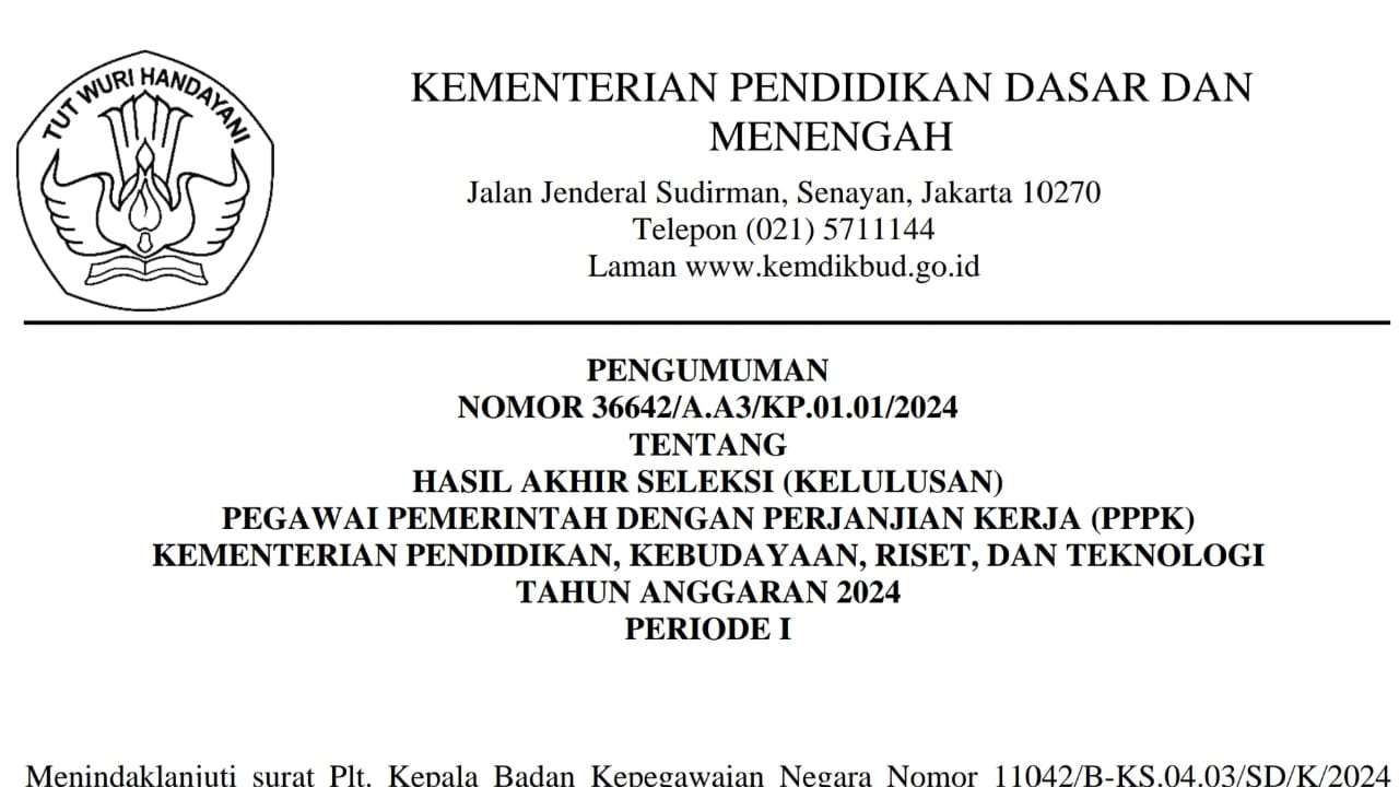 KBRN, Sorong: Kementerian Pendidikan, Kebudayaan, Riset, dan Teknologi (Kemendikbudristek) telah mengumumkan hasil akhir seleksi Pegawai Pemerintah dengan Perjanjian Kerja (PPPK) untuk tahun anggaran 2024 pada 31 Desember 2024. Informasi ini disampaikan melalui situs resmi Kemendikbudristek, mencakup kelulusan peserta pada Periode 1 seleksi PPPK.