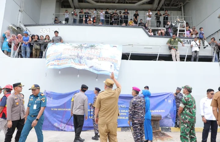 KRI TNI AL yang membawa pemudik dengan rute pelayaran Jakarta– Tanjung Gudang Belinyu Kabupaten Bangka tiba Senin sore, 16 Maret 2026 (Dok: Biro Adpim Babel)