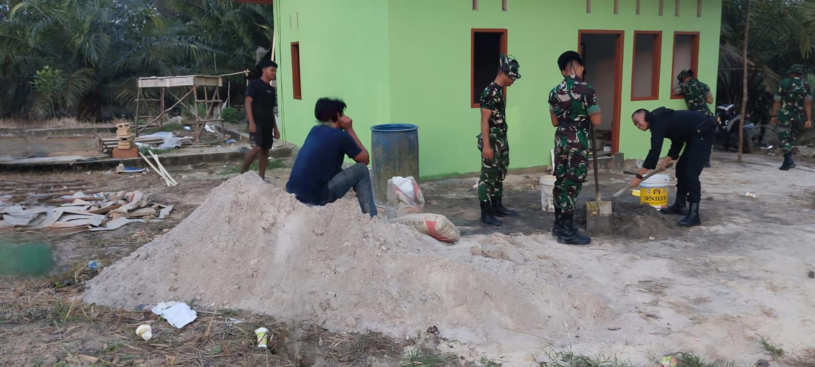 Rudiansyah (baju biru) sedang duduk sambil menatap ke arah rumah yang ia huni bertahun-tahun, kini sedang di renovasi oleh prajurit TNI bersama warga.