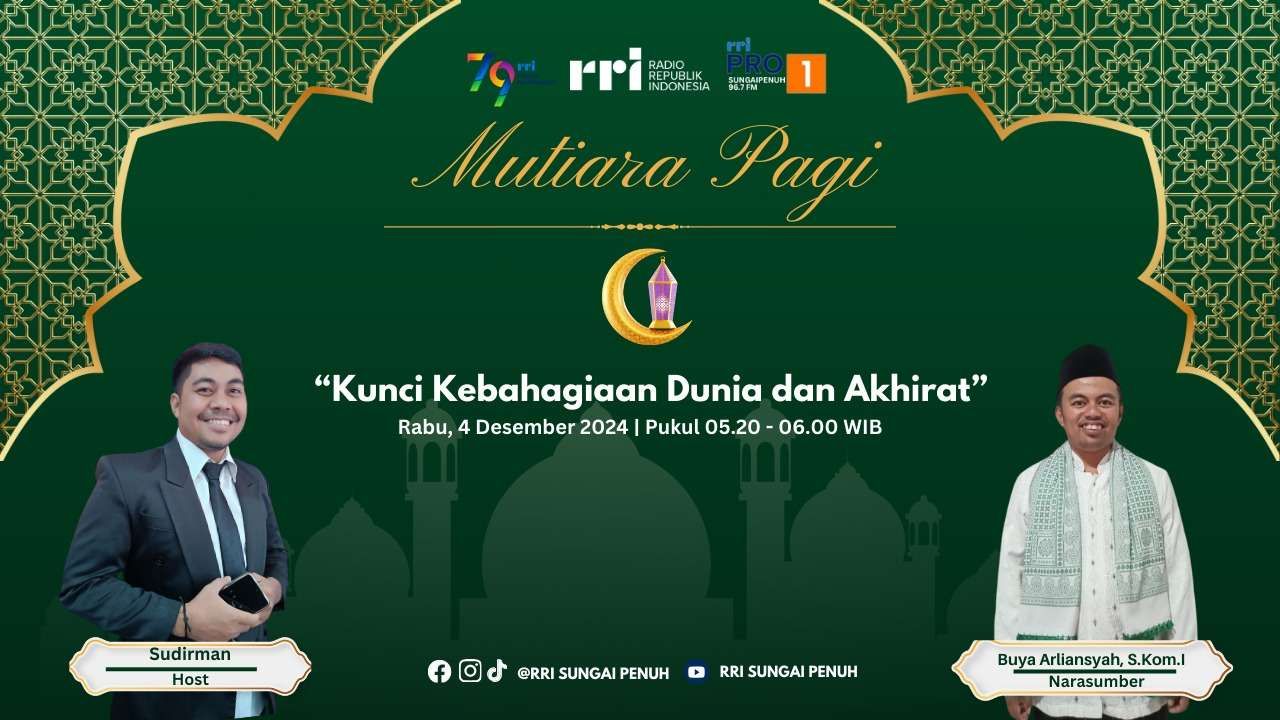 KBRN, Sungai Penuh : Setiap manusia dengan ragam profesi yang digelutinya senantiasa mencari dan mengupayakan kebahagiaan. Kedudukan dan posisi yang diupayakannya tiada lain adalah dalam rangka mencari kebahagiaan. Jerih payah seorang pebisnis, penjual makanan, minuman, pakaian, dan ragam profesi lainnya dalam mengumpulkan uang, adalah dalam rangka mencari kebahagiaan. Karena itu, kebahagiaan merupakan orientasi utama setiap manusia dalam menjalani setiap episode kehidupan ini. Hal itu disampaikan oleh buya Arliansyah, S.Kom.I pada Dialog Mutiara Pagi RRI SP Sungai Penuh Rabu (4/12/2024).
