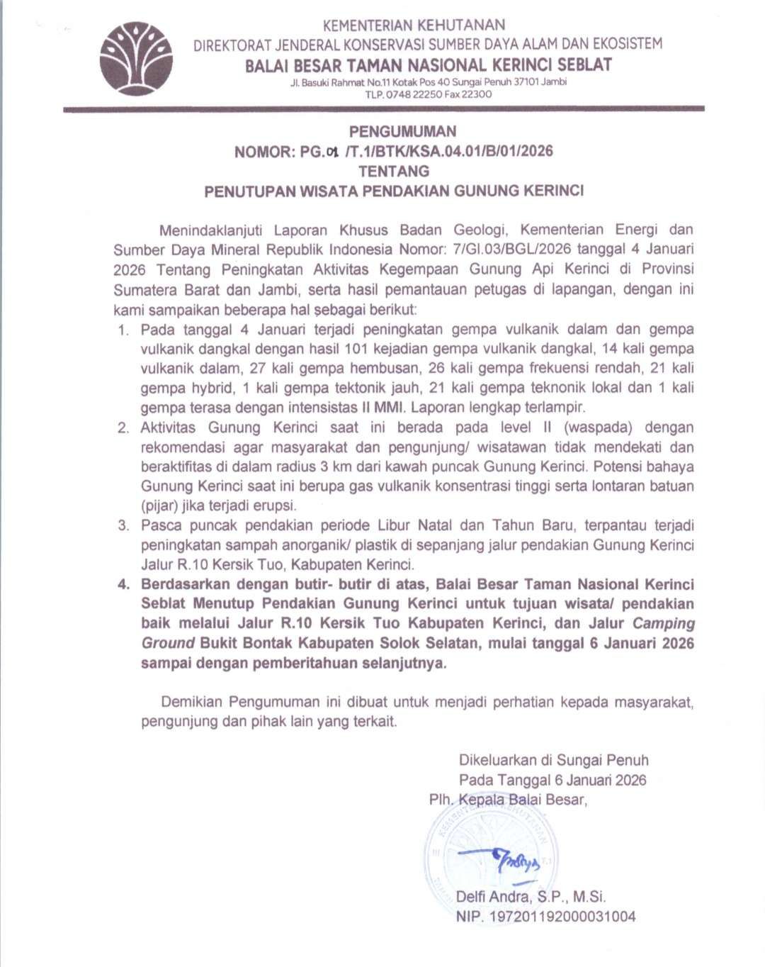 Penutupan ini tertuang dalam Pengumuman Nomor: PG.01/T.1/BTKSA.04.01/B/01/2026 yang dikeluarkan pada 6 Januari 2026, sebagai tindak lanjut laporan khusus Badan Geologi Kementerian Energi dan Sumber Daya Mineral (ESDM) terkait peningkatan kegempaan Gunung Api Kerinci.