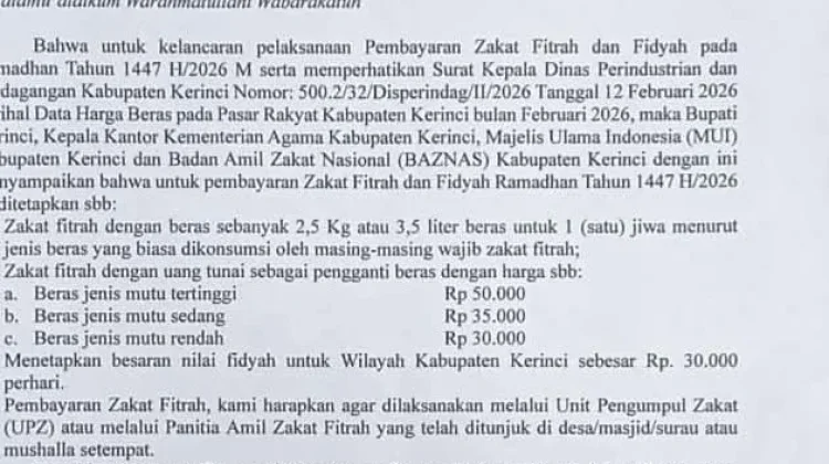 Penetapan tersebut tertuang dalam keputusan bersama Bupati Kerinci, Kementerian Agama Kabupaten Kerinci, MUI Kabupaten Kerinci, dan Baznas Kabupaten Kerinci tentang ketetapan pembayaran zakat fitrah dan fidyah Ramadan 1447 H/2026 M.