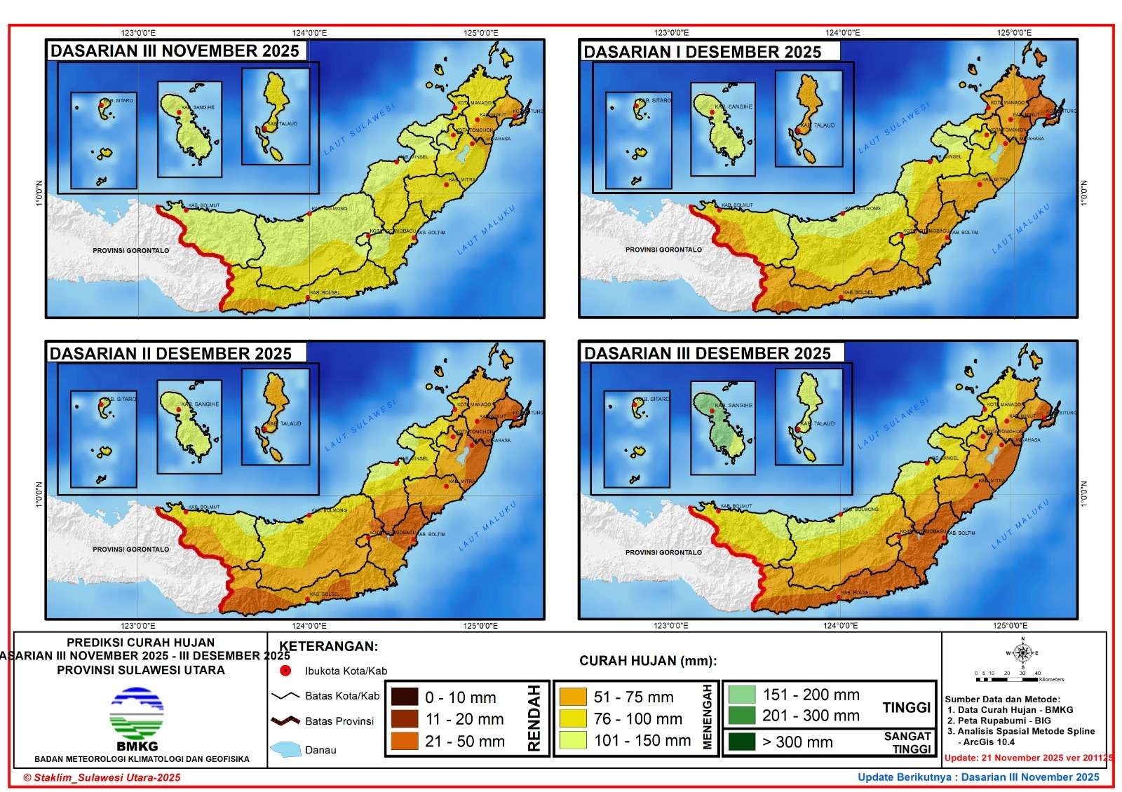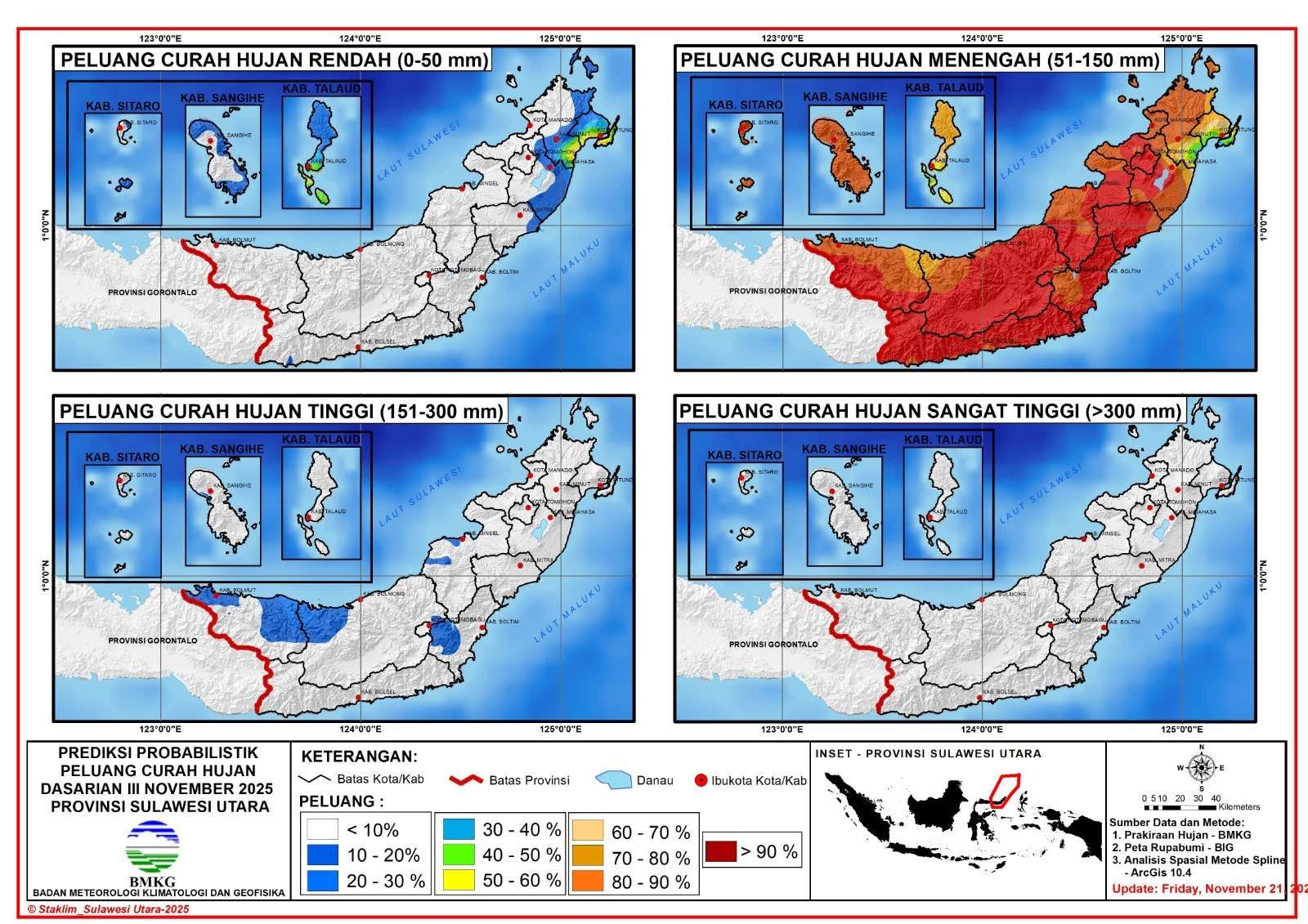 KBRN, Manado: Berdasarkan analisis data curah hujan dari stasiun pos hujan kerjasama yang tersebar di seluruh wilayah Provinsi Sulawesi Utara, update tanggal 21 November 2025,