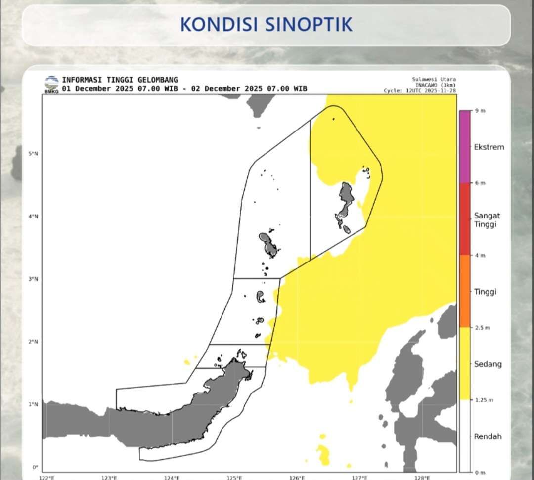 Berdasarkan analisis BMKG, tinggi gelombang yang diperkirakan berpotensi terjadi berada dalam kisaran 1,25 hingga 2,5 meter (kategori sedang). Kondisi gelombang sedang ini diprediksi berpeluang terjadi di tiga wilayah perairan utama di Sulawesi Utara, yaitu: