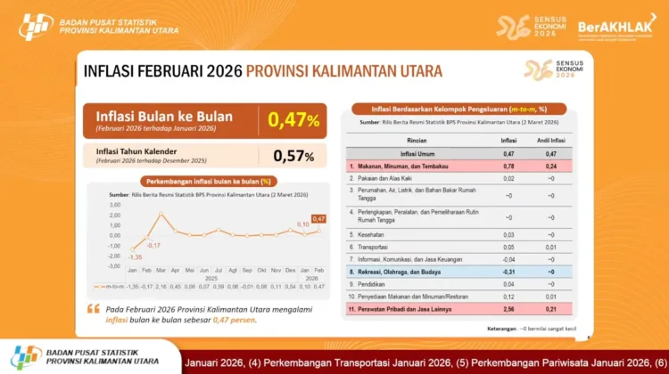 RRI.CO.ID, Tanjung Selor - Kalimantan Utara (Kaltara) mencatatkan kenaikan indeks harga yang cukup signifikan pada bulan kedua tahun 2026. Berdasarkan data terbaru, provinsi termuda di Indonesia ini mengalami inflasi bulan ke bulan (month-to-month) sebesar 0,47 persen pada Februari 2026.
