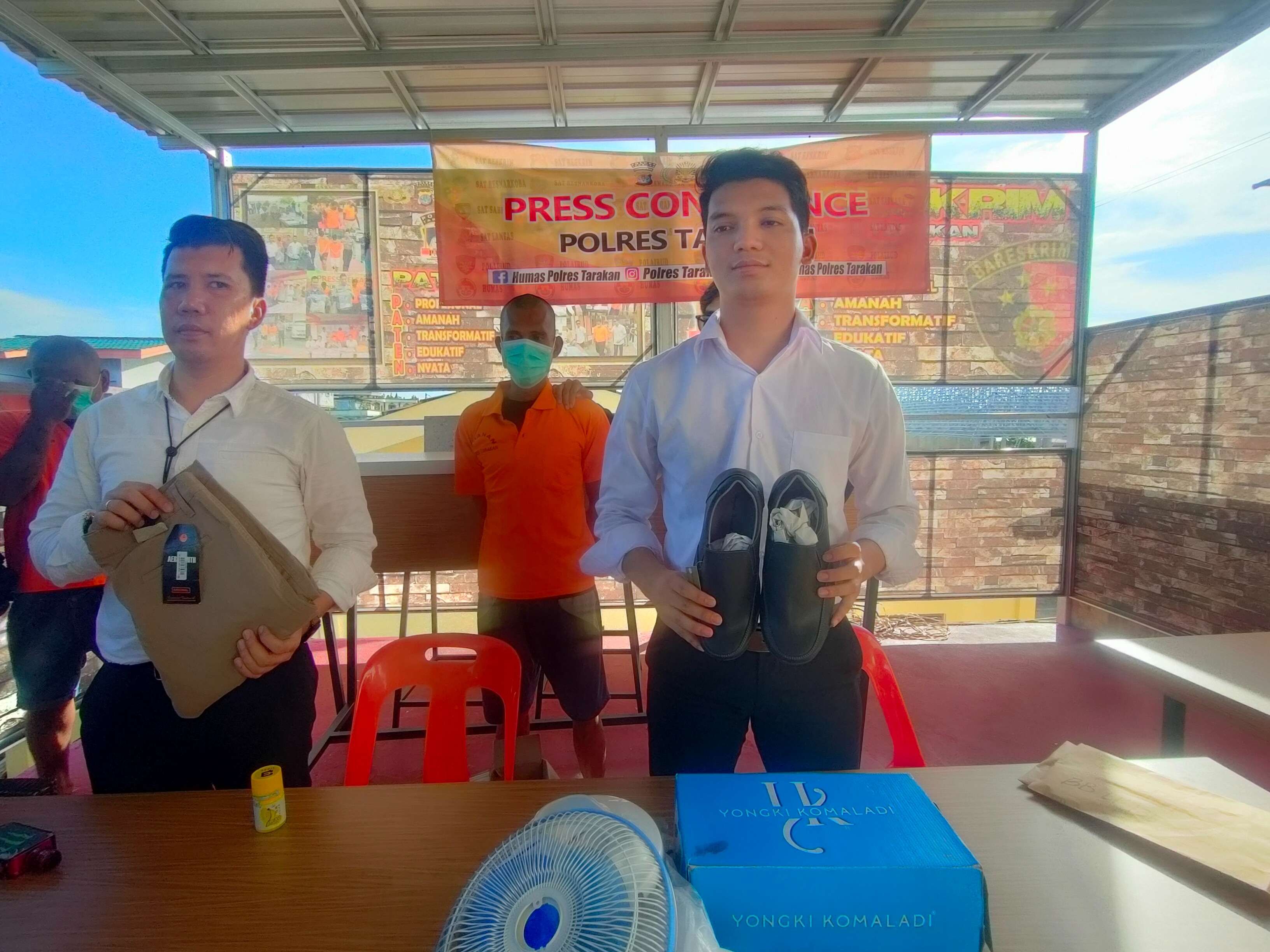 Untuk barang bukti yang diamankan yakni Uang tunai Rp 3.597.000, 1 lembar celana panjang warna coklat merk Areo Smith, 1 unit kipas angin putih merk Miyako, 1 pasang sepatu hitam merk Yongki Komaladi, 8 buah kotak amal, handphone Asus, dan baju bola berwarna silver merk Lieseven