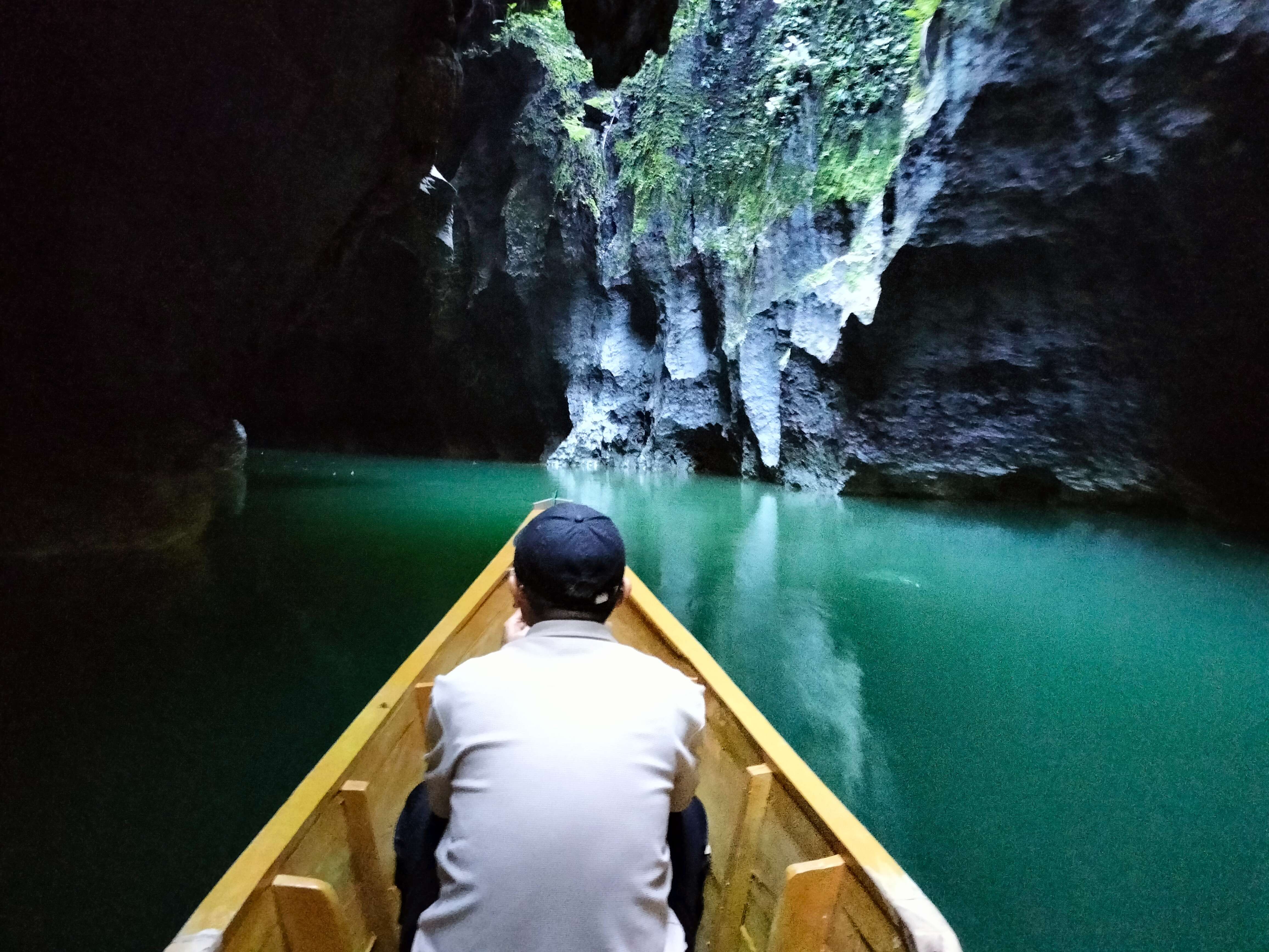 Tak lama kemudian, sebuah lorong menyeruak di hadapan, berbentuk terowongan, gelap pekat, nyaris tanpa celah cahaya. Mesin ketinting dimatikan, suasana hening seketika. Perahu kembali digerakkan oleh dayung, menyusuri lorong sunyi itu.