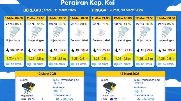 RRI.CO.ID, Langgur - Prakiraan cuaca Kota Tual, Kabupaten Maluku Tenggara Kabupaten Maluku Barat Daya, Kabupaten Kepulauan Tanimbar dan Kabupaten Kepulauan Aru pada Rabu (11/3/2026) yang dihimpun rri.co.id pada Selasa (10/3/2026) sore berdasarkan hasil pengamatan Badan Meteorologi Klimatologi dan Geofisika (BMKG) Provinsi Maluku.