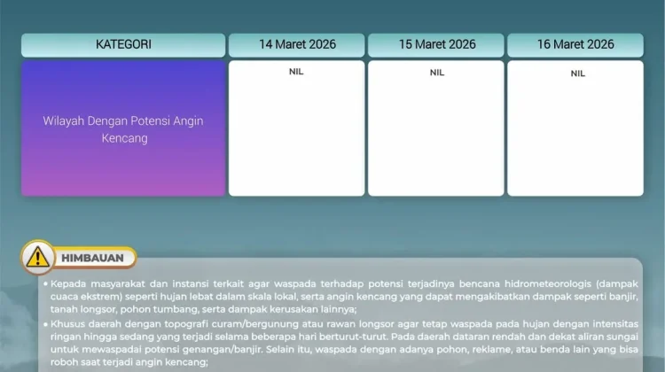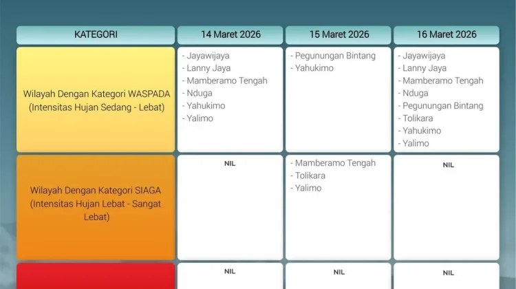 RRI.CO.ID, Wamena - Dari BMKG Wamena Berikut Informasi Peringatan Dini Cuaca 3 Hari Kedepan yang berlaku mulai Sabtu (14/03/2026) s/d Senin, (16/03/2026). Informasi berikut memuat wilayah dengan potensi peringatan dini kategori Waspada (Hujan sedang-lebat), Siaga (Hujan lebat-sangat lebat), dan Awas (Sangat lebat-ekstrem), selain itu Kami juga sampaikan informasi peringatan dini wilayah yang berpotensi terjadi angin kencang.