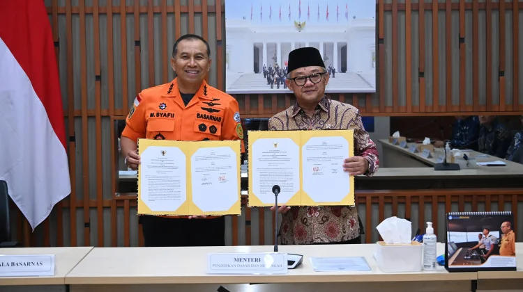 RRI.CO.ID, Jakarta - Menteri Pendidikan Dasar dan Menengah Abdul Mu'ti, menandatangani nota kesepahaman (MoU) dengan Badan Nasional Pencarian dan Pertolongan (Basarnas). Lewat car aini, kedua institusi ingin memperkuat sinergi lintas instansi.